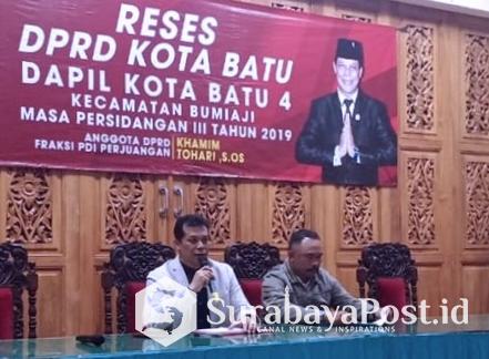 BATU (Surabayapost.id ) – Ratusan warga Dusun Gondang, Desa Tulungrejo, Kecamatan Bumiaji, Kota Batu menghadiri masa reses anggota DPRD Kota Batu, H Khamin Tohari, S Sos. Reses tersebut digelar di Balai Desa Tulungrejo, Kecamatan Bumiaji, Kota Batu, Jumat (27/12/2019) malam. Prosesi reses dari politisi partai PDIP, Daerah Pemilihan (Dapil) 4, Kecamatan Bumiaji Kota Batu tersebut, diwarnai beragam usulan dari warga setempat. Salah satunya usulan itu terkait pemekaran Desa Tulungrejo. Untuk diketahui prosesi reses dari mantan wartawan itu mengundang sejumlah 200 warga berasal dari 9 desa di Dapil 4 Bumiaji.